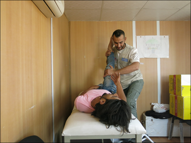 Die Stunde ist beendet. Omar bedankt sich beim Physiotherapeuten von Handicap International und fügt hinzu: "Wenn du und deine Organisation nicht hier wärt, dann wüsste ich nicht, was aus mir geworden wäre. Ihr gebt mir das Gefühl, dass ich geschätzt werde – dass ich eine Rolle in der Gesellschaft spiele. Ich bin immer noch sehr belastet, doch nach jeder Behandlung fühle ich ein bisschen mehr, dass es etwas gibt, wofür es sich zu kämpfen lohnt. Ich fühle mich jedes Mal erleichtert, wenn ich hinausgehe."